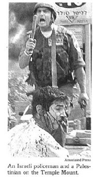Die Bildunterschrift lautete: "Ein israelischer Polizist und ein Palästinenser auf dem Tempelberg". Doch der angebliche "Palästinenser" war ein jüdischer Student aus den USA, den der Polizist vor einem palästinensischen Mob gerettet hatte. Nachdem das Bild am 30. September 2000 in der "New York Times" erschienen war, meldet sich dessen Vater Aaron Grossman in einem Leserbrief an die AP zu Wort: "Der Palästinenser ist in Wahrheit mein Sohn, Tuvia Grossman, ein jüdischer Student aus Chicago. Er, sowie zwei seiner Freunde, wurden während einer Fahrt durch Jerusalem durch eine Horde palästinensischer Araber aus ihrem Taxi gezerrt und unerbittlich geschlagen und schwer verwundet. Das Bild kann nicht auf dem Tempelberg aufgenommen worden sein, weil es auf dem Tempelberg keine Tankstelle gibt und schon gar keine mit hebräischen Buchstaben, wie die Zapfsäule, die deutlich hinter dem israelischen Soldaten zu sehen ist, der gerade versucht, meinen Sohn vor dem Mob zu schützen."