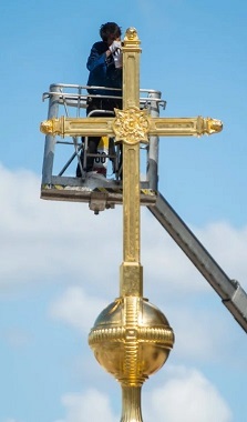 An der Kuppel unter dem vergoldeten Kreuz befindet sich ein blaues Band mit goldener Inschrift: "Es ist in keinem andern Heil (…) denn in dem Namen Jesu, zur Ehre Gottes des Vaters. Dass in dem Namen Jesu sich beugen sollen aller derer Knie, die im Himmel und auf Erden und unter der Erde sind."